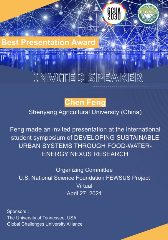 冯晨同学的报告题目为“Study on the Sustainability of Rice Production in Liaoning Province”,介绍了基于生命周期评价视角的水稻生产的环境影响评估。作为获奖者之一,该同学受特别邀请将参加2021年11月在美国举行的FEWSUS国际大会,会议方将为获奖者提供赴美参会的全部费用。