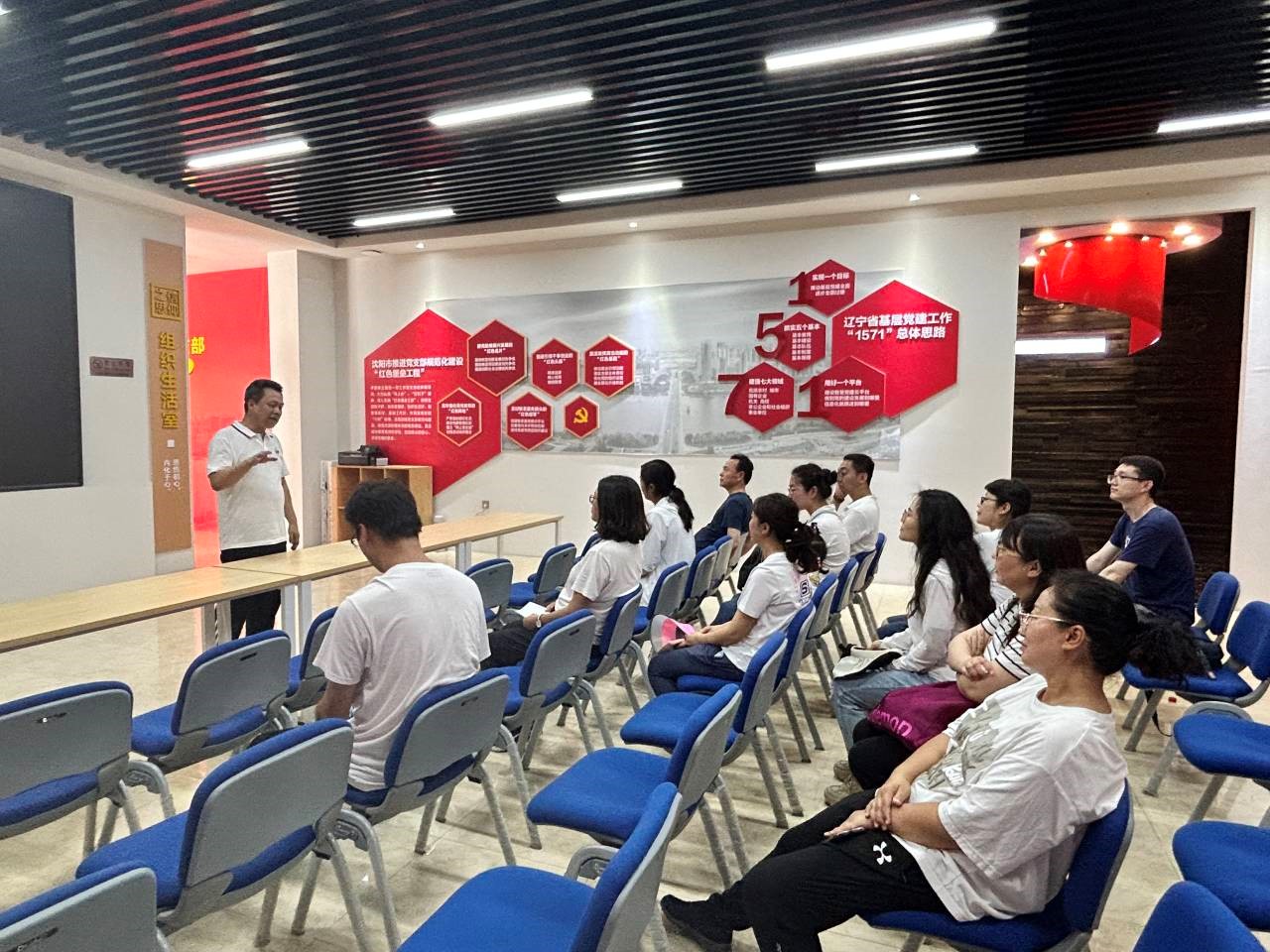 大家先来到苏家屯区杨城寨村、马耳山村等地考查调研乡村经济发展情况,探讨新时期生态文明背景下乡村振兴的新思路。随后,大家又来到沈南第一党支部纪念馆参观学习红色历史。这里曾经是苏家屯区第一个党组织(时称“辽阳特支”)成立的地方,沈南地区的革命先辈们积极投身革命活动,宣传抗日救国道理,散发传单、组织罢锄斗争、团结群众参加革命活动,为沈阳地区革命运动播下星星之火,打下深厚的群众基础,积极引导影响了一大批有志青年寻找党组织、走上革命道路,在中国共产党的历史上留下了浓重的一笔。参加活动的党员同志们在党旗下重温入党誓词,在组织生活室召开了一次特殊的组织生活会。邹洪涛院长为党员同志上了一次题为“坚定理想信念,回忆党的历史”的党课,激励大家不忘初心、牢记使命、努力工作,为学校和学院建设贡献力量。刘鸣达教授也在会上结合自己的工作经历鼓励青年教师学党史、明真理,敢为人先、一心为民,努力让党的事业薪火相传。党支部书记党秀丽副教授也要求所有老师继续发扬艰苦奋斗的精神,为专业建设添砖加瓦。