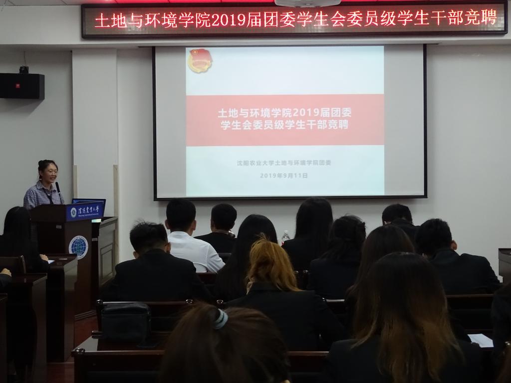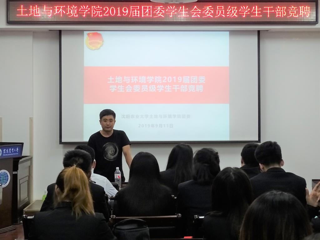 2019年9月11日晚,土环学院2019届团委学生会委员级学生干部竞聘大会在土壤楼B座102顺利举行。本科生辅导员范超老师、部长级及以上学生干部担任评委团,19级学生代表参与会议,组织部部长张咏琪主持会议。