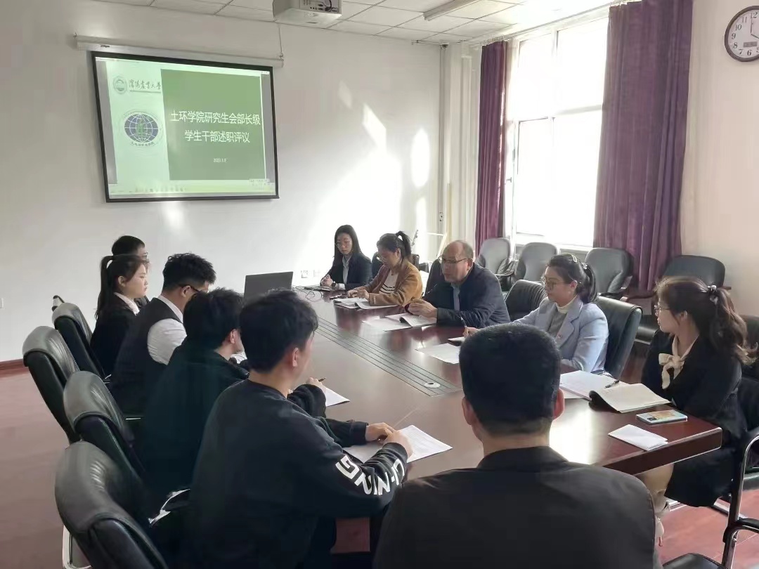 进一步深化研究生会改革,增强研究生会工作人员自觉接受监督的意识和服务同学的责任感和价值感,促进研究生会更好服务青年学生成长成才,土环学院分别于3月9日、13日召开研究生会部门负责人和工作人员述职评议大会,院党委书记陈志刚、团委书记王彤、辅导员孙鑫、苏欣、研究生会干部出席述职评议大会。