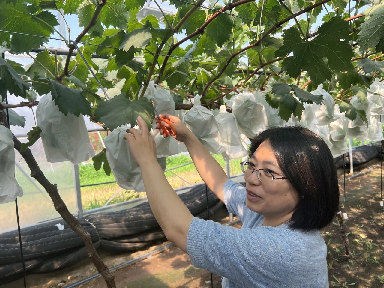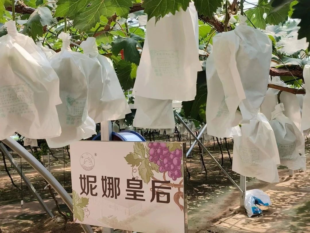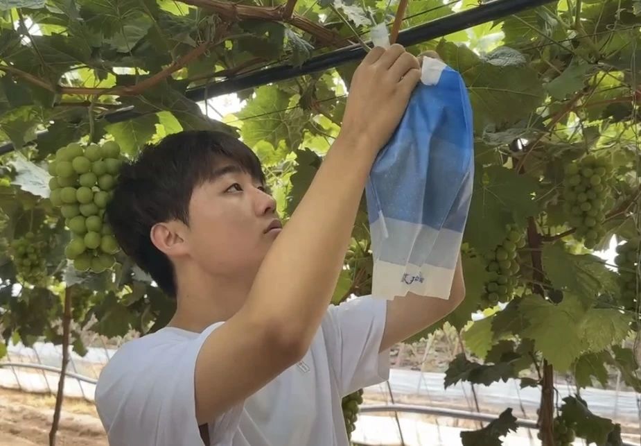 上午,我们顶着太阳,在闷热的葡萄棚与研究生学长学姐一同进行了两小时的套袋工作,深深体会了农业生产者的不易,同时也通过帮助村里农户进行大棚葡萄套袋,了解到对距离成熟期还有两月的阳光玫瑰进行套袋处理,有防止果实日灼,减轻虫害,减少裂果等作用。