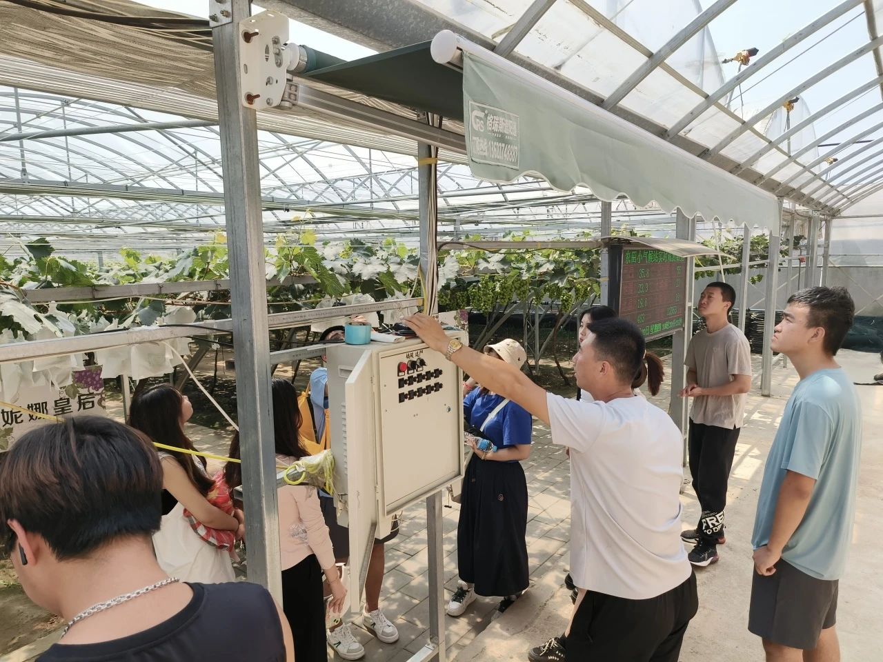 张雪婷等研究生学长学姐带领我们前往小 院后面的葡萄种植棚,为我们介绍小院葡萄棚内的设备设施与种植葡萄种类,着重介绍了新引进品种“妮娜皇后”,我们从学长学姐的介绍中受益匪浅。