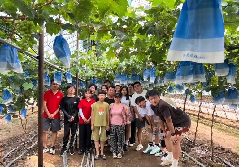 由几位研究生学姐学长带队,前往农户的葡萄棚中,对农户进行沟通交流,走访农户的过程中我们了解到目前农户种植的葡萄品种主要是阳光玫瑰和妮娜皇后,葡萄销售渠道有外包、电商等,同时也了解到,电商售出比整棚外包收入更多,而当地大多农户对电商直播等渠道销售葡萄有一定的了解,但出于某些原因,大家对电商这一售出渠道的应用度低。这次走访使我们更深刻也更加直观感受到在产品销售和宣传方面面临的困难与挑战,同时也看到了电商助农的发展潜力。