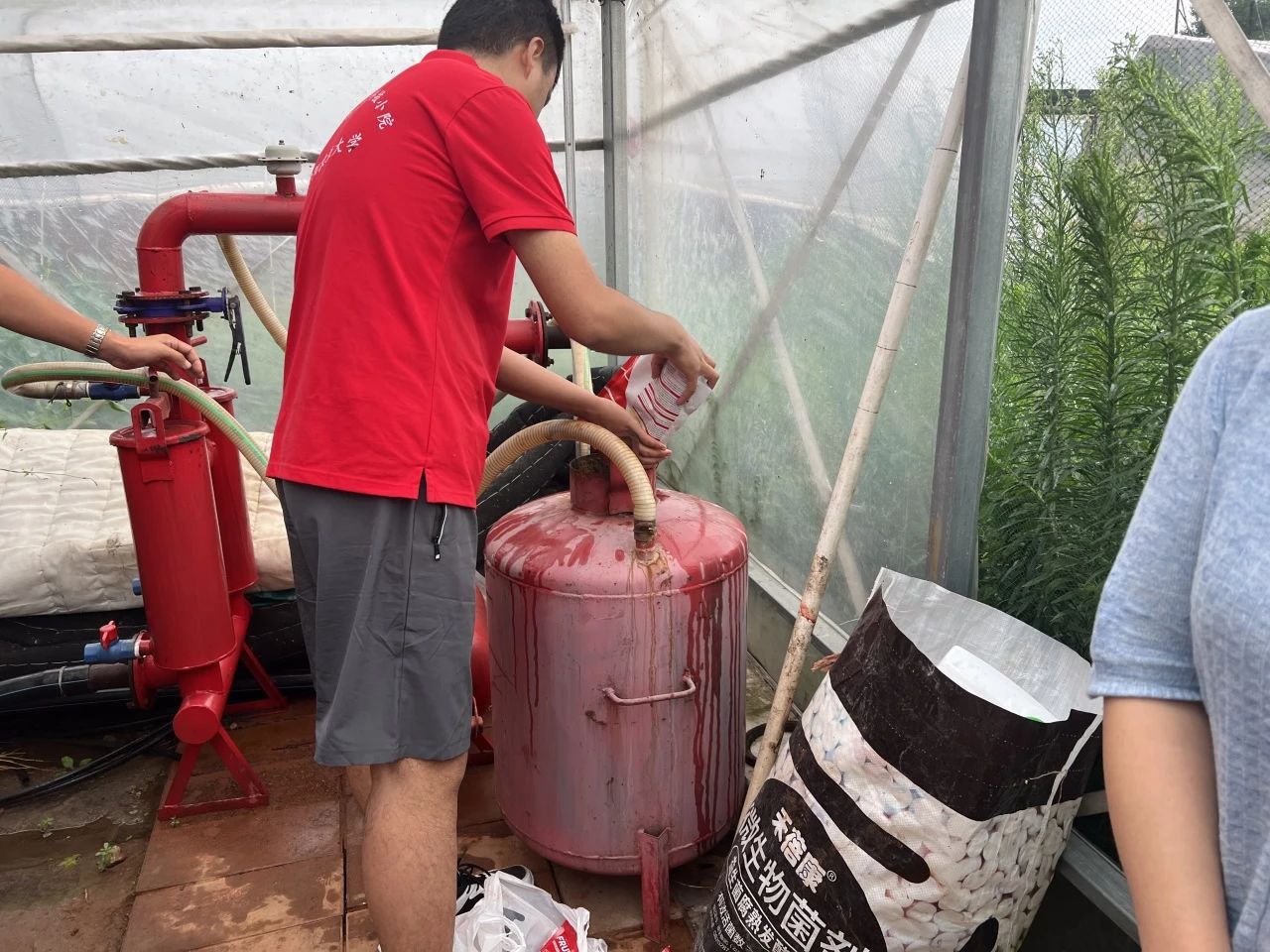下午,在指导教师刘侯俊的带领下,我们来到小院后方的葡萄棚中,研究生学长为我们示范水肥一体化设备的使用操作,在操作过程中,刘老师向我们介绍了葡萄棚使用肥料“翠柳”与肥料包装袋上的参数含义,在实地为我们上了生动的一课,与此同时我们对专业知识有了更深刻更直观的了解。