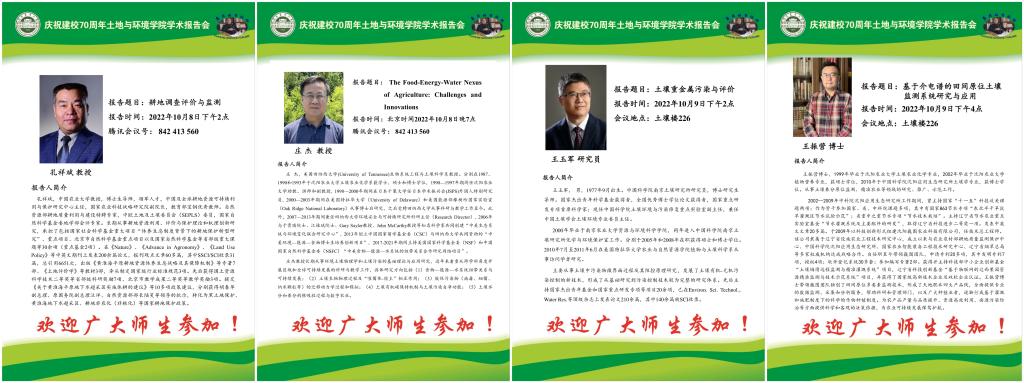 为庆祝我校成立70周年,黄色直播 特邀孔祥斌教授、庄杰教授、王玉军研究员和王振营博士于2022年10月8日-9日开展恩凤学术论坛报告会,欢迎广大师生参加!