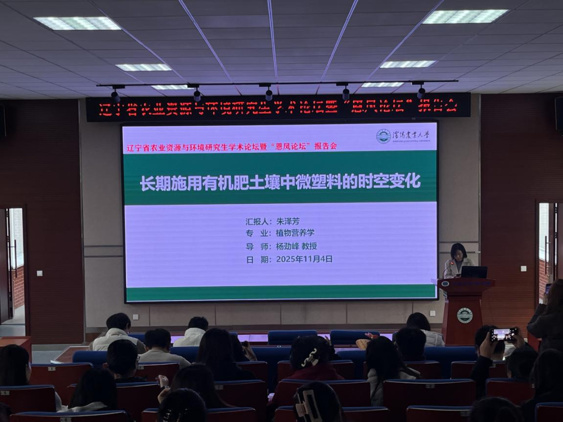 2025年11月12日,第十三期辽宁省农业资源与环境研究生学术论坛暨“恩凤论坛”报告会在土壤楼A座226报告厅成功举行。本次论坛特邀植物营养与施肥技术团队的2022级博士生朱泽芳进行学术汇报,报告题目为“长期施用有机肥土壤微塑料的时空演变”。王月老师主持本次会议。